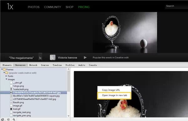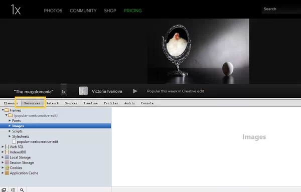 打开你要下载的图片所在页(以1X为例),按下 F12 调出后台,别紧张,不用看代码的,找到 Resources栏目下的Images标签,然后展开!